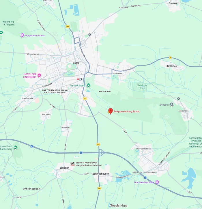 Planen Sie die Abholung bei Partyausstattung Strulla, Ihrem Experten für Eventzubehör und Ballongeschenke in Gotha. Damit Ihre Vorbereitungen stressfrei beginnen, führen wir Sie hier auf dem schnellsten Weg direkt zu uns in den Siebleber Weg 13.